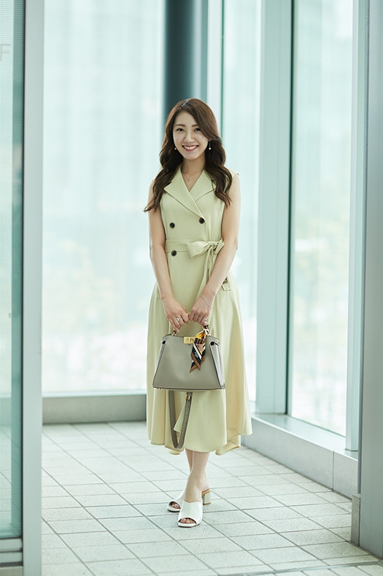トレンドカラーのイエローのワンピースは『Mystrada』のもの。『フェンディ』のグレーのピーカブーバッグにイエローのスカーフを巻き、フェミニンなコーディネートを完成させています。