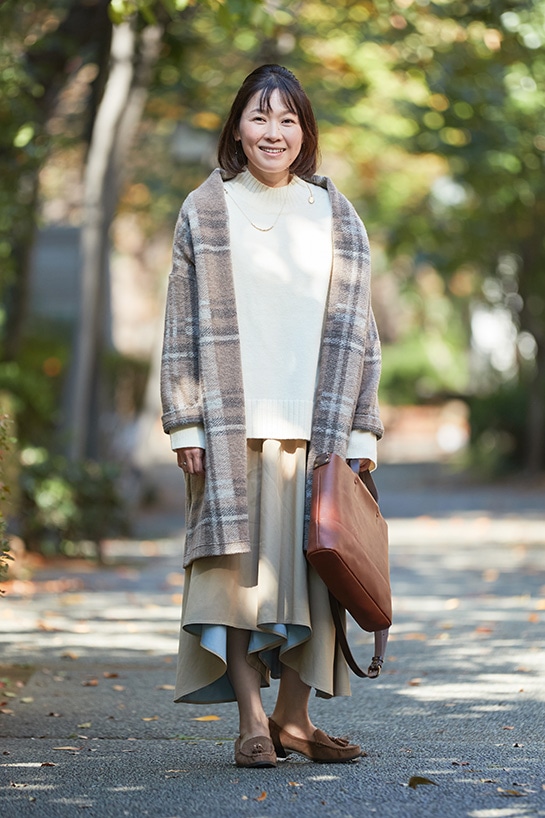 ふんわりとした白ニットにロングネックレスを合わせた田島さん。お気に入りのネックレスはバラバラにすることができて、短めのスタイルで楽しむこともできるので、気分や洋服に合わせて楽しんでいるそう。
