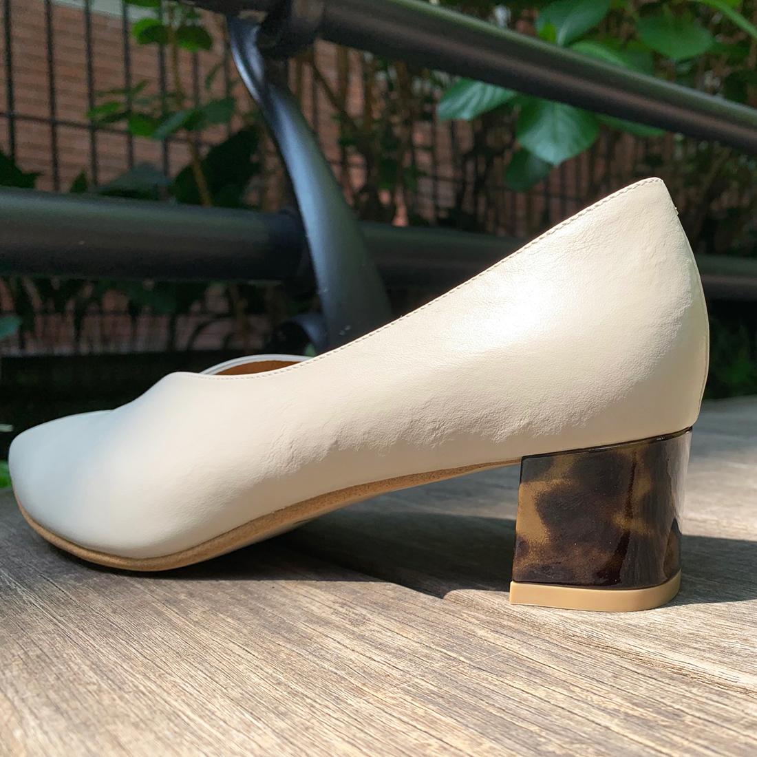 べっ甲巻きのフレアーな形のヒールがポイント! 安定感のある履き心地とエレガンスの共存。 -