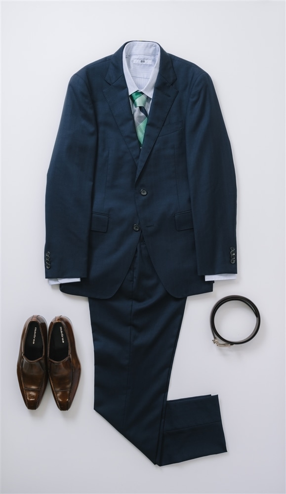 定番のネイビーカラーのスーツには制服のような雰囲気が出ないようストライプのシャツを合わせて少し柔らかい印象に。
