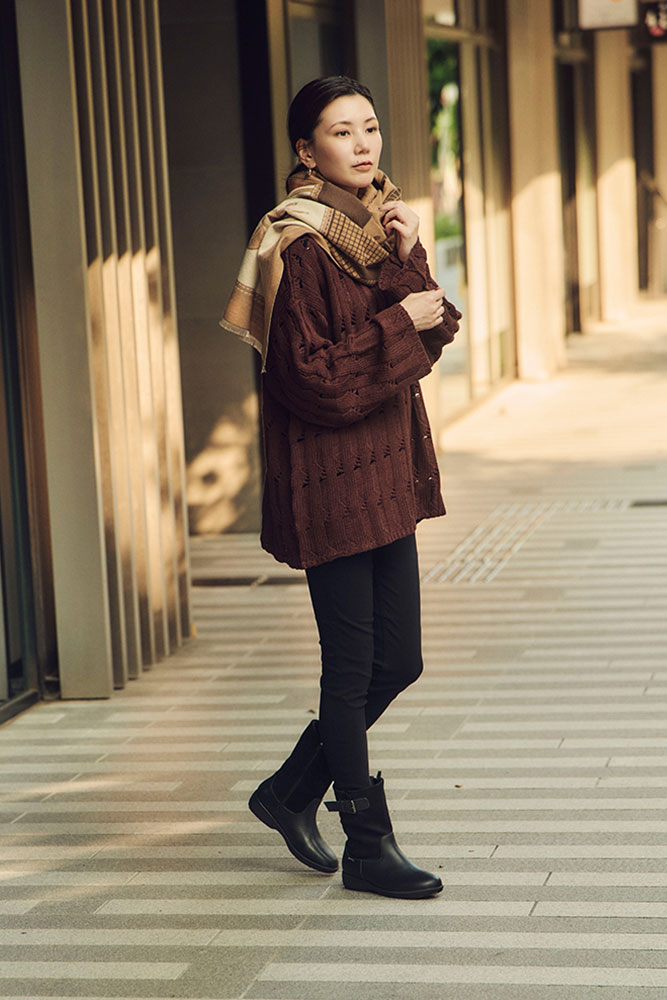 シューズはライトブラウンのスリッポンタイプで流れるようなスワールのラインが上品な雰囲気を演出してくれます。