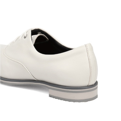 定番のロゴトレーナーはカジュアルになり過ぎないように足元をレースアップシューズで引き締めると