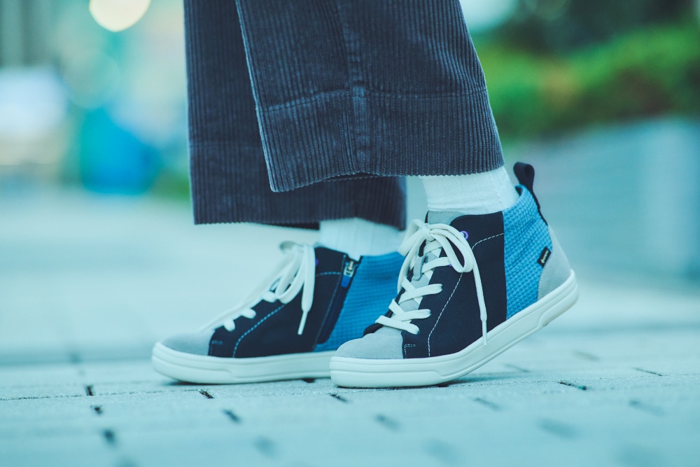 楽に脱ぎ履きできるサイドファスナー仕様の防水ハイカットスニーカー。