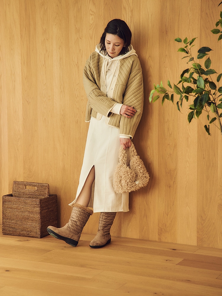 オフホワイトとベージュで叶えるナチュラルなぬくもりコーデ。オフホワイトのワンピースに淡いベージュのアウターやバッグを組み合わせた、ぬくもりを感じさせる落ち着きのあるスタイルです。足元には他のアイテムよりも少し濃いめのブーツを履けば、全体を引き締める効果も。