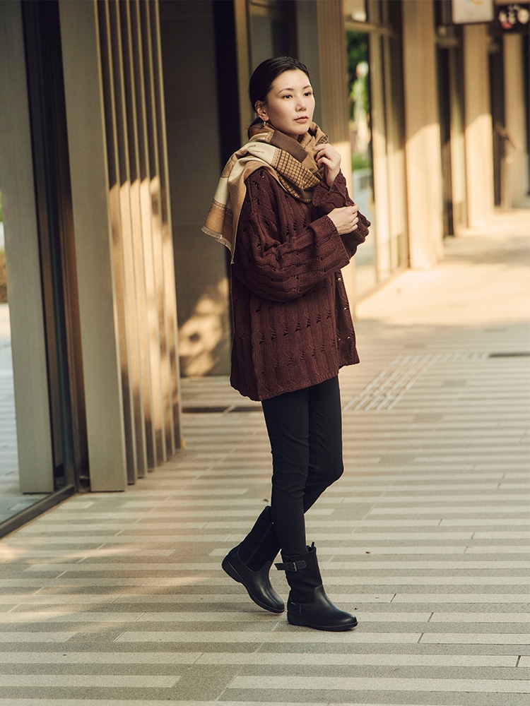 スキニーボトムには足首もあたたかいミドルブーツを組み合わせて、足先のボリューム感UPでトップスとのバランスを。