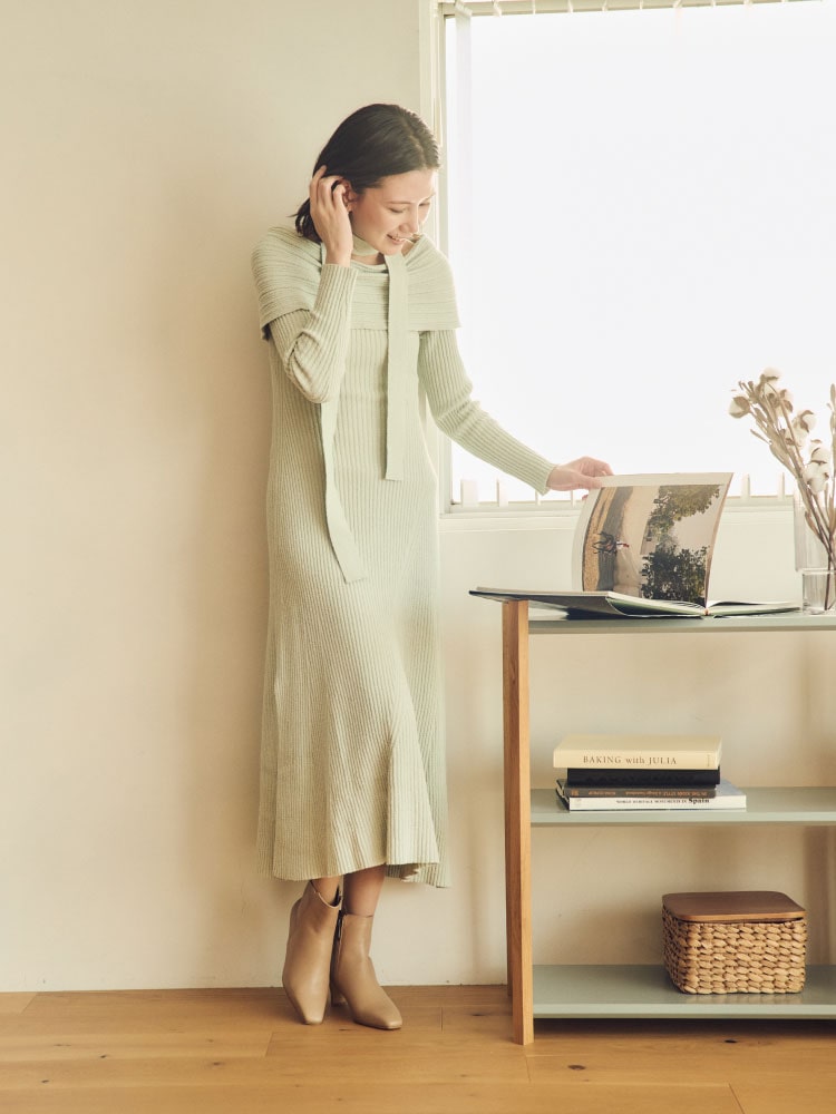 ミントグリーンのニットワンピのみでまとめたリラックスコーデ。