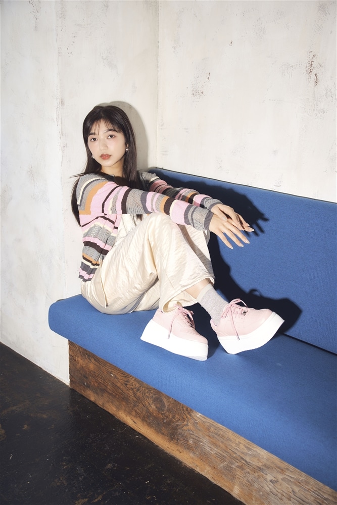 コンパクトなシルエットに厚底シューズを合わせることで、バランスの取れた今っぽいスタイリングに仕上がります。