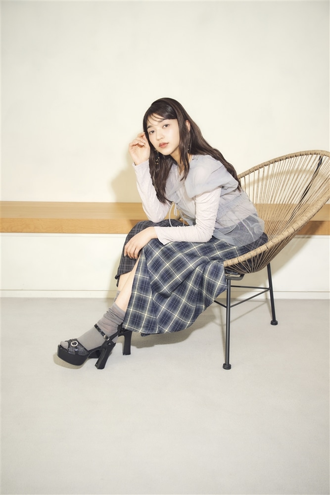 シアートップスにチェック柄スカートを合わせた、上品でレトロなガーリースタイル。