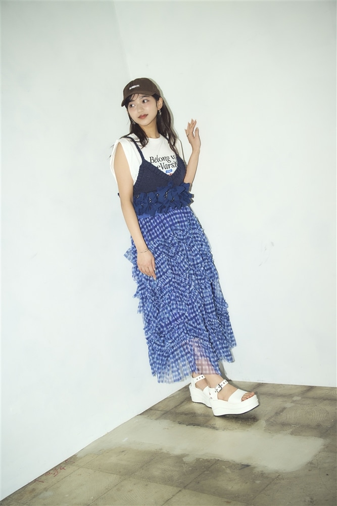 キャップとロゴTに華やかなチェック柄スカートを合わせた、ストリート感のあるミックスコーデ。