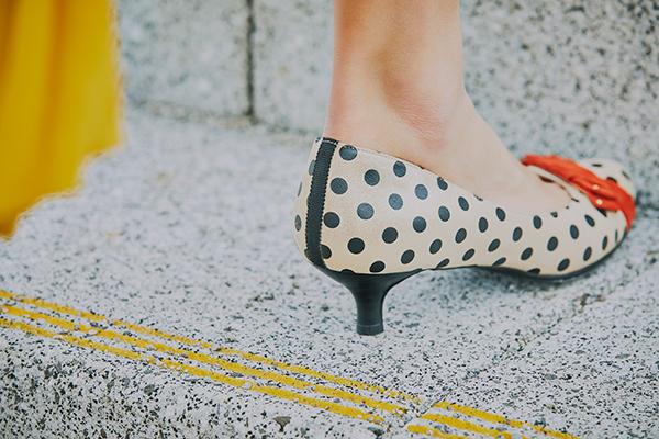 雨をイメージした水玉模様に、綺麗なサイドのカットワーク、甘すぎないリボンがポイントのパンプス。可憐な印象のプリーツスカートやサッシュベルトと合わせても、フェミニンだけじゃない、大人の女性らしさを引き立ててくれます。