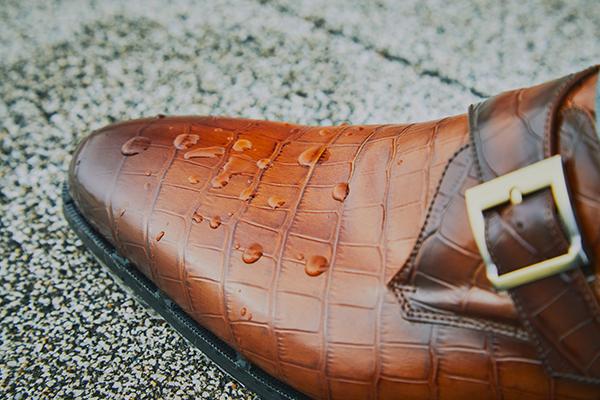 防水・透湿性に優れたeVent®ファブリックと撥水加工の施されたクロコ型押しのレザーを組み合わせたモンクストラップ。