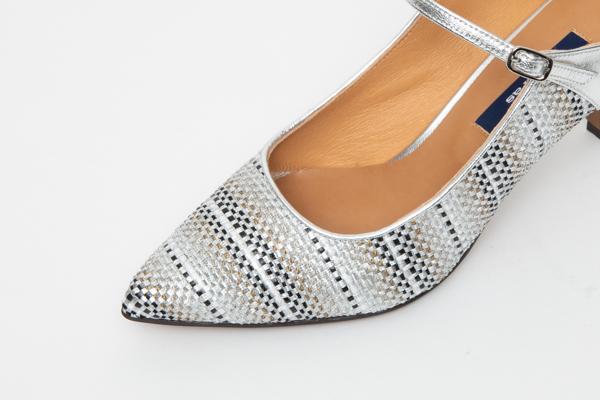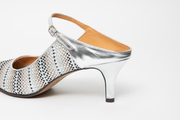 今シーズンのトレンド、ベルテッド・ミュール・パンプス。col.ホワイト、ブラックには柔軟性のある子山羊革を、col.シルバーテクスチャーには、ナチュラルなラフィア調メッシュ素材にメタリック糸を絡めた特別素材を使用。ミニ・ベルトが足の甲をホールドし、歩きやすさも実現。