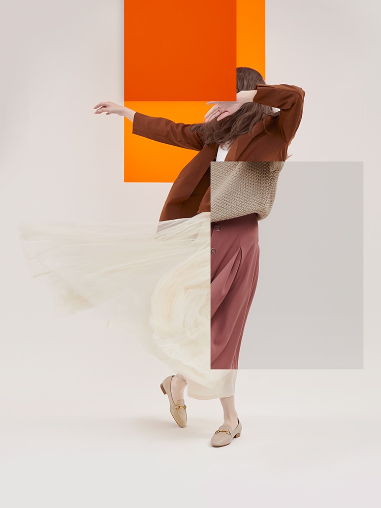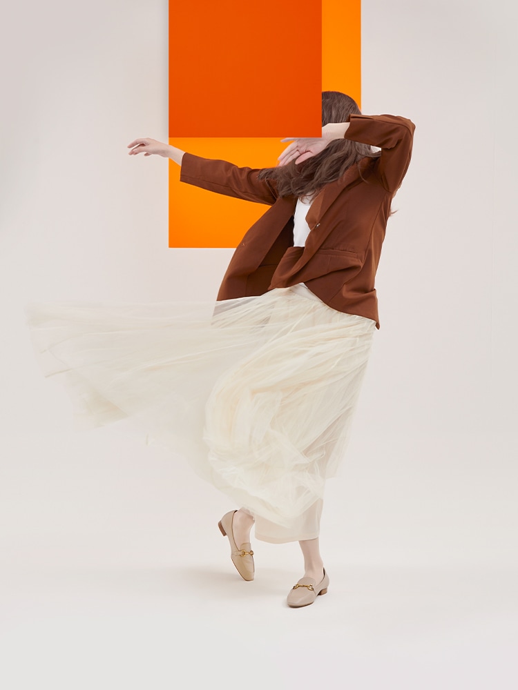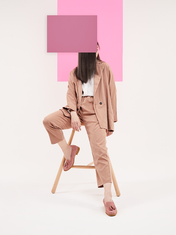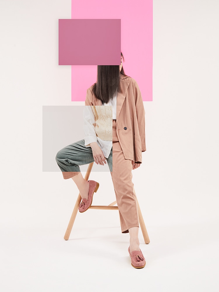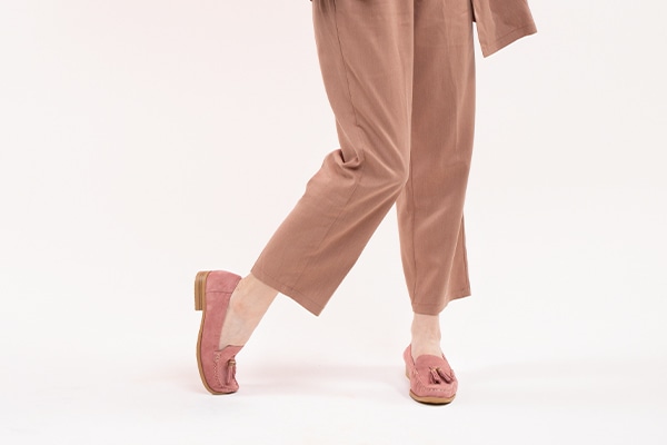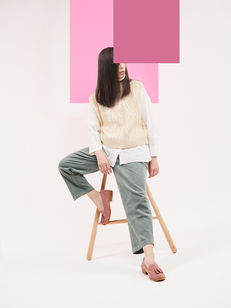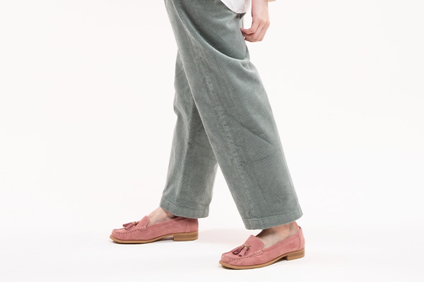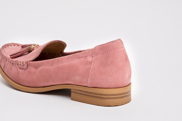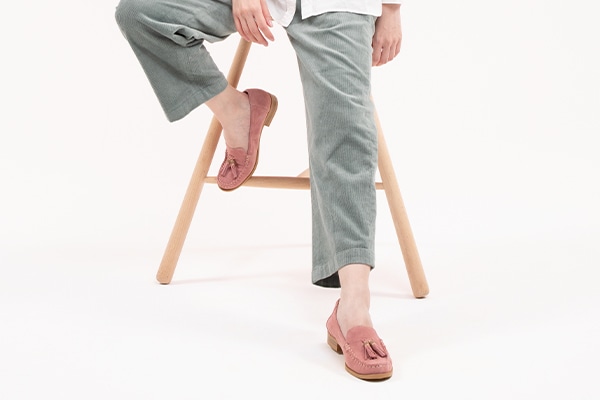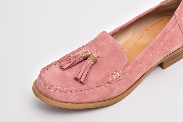 タッセルと淡い色合いが目を引くモカシンパンプス