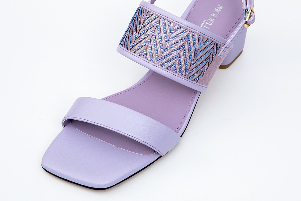 繊細に配置された貴石装飾と、レーザーカット加工の柄が印象的なサンダル。