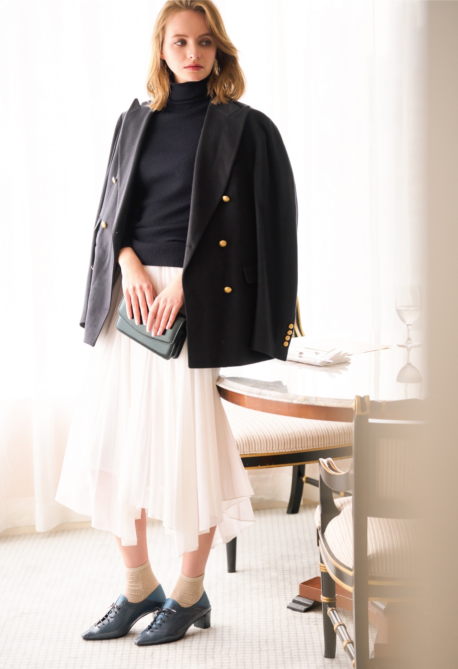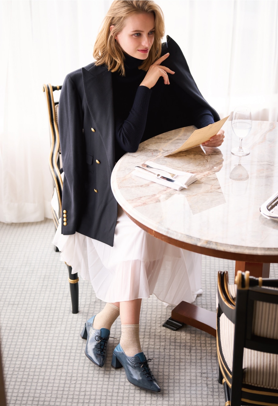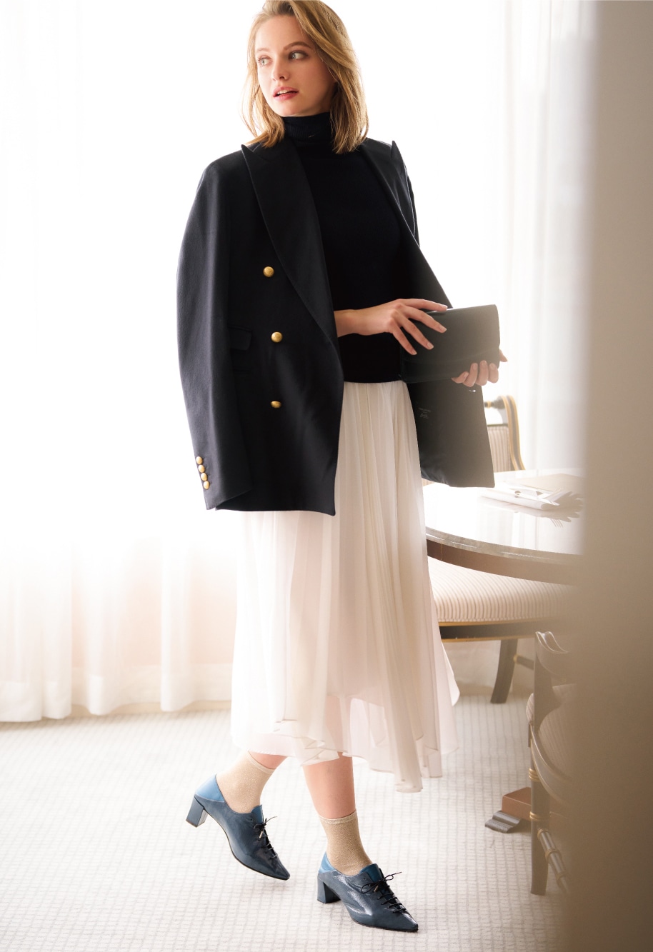 スクエア・トゥのスッキリとした美しいシルエットが、足もとを華やかに演出します。
