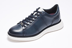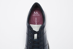 ゴールドランク認証を得たソフトキップレザーを採用したエレガントなネイビーのレースアップスニーカー。