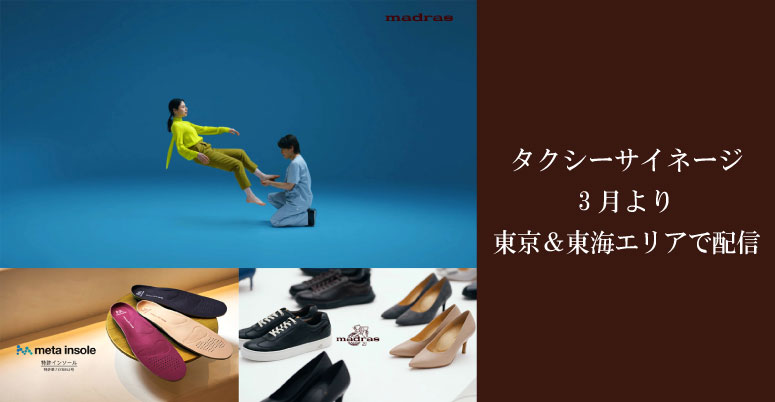 独自開発した高機能インソール「metaインソール(R)」搭載シューズを紹介するタクシーサイネージを、