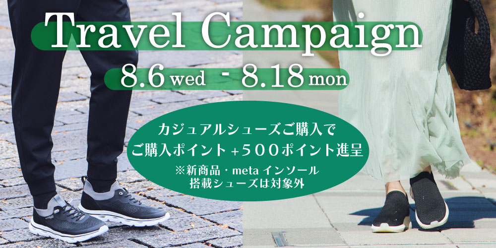 ◇夏旅を応援!◇ 期間中に対象のカジュアルシューズをオンラインショップにてご購入いただくと、 ご購入ポイントに加えて500ポイントを進呈いたします! 期間:2025年8/6(水) ~ 8/18(月)