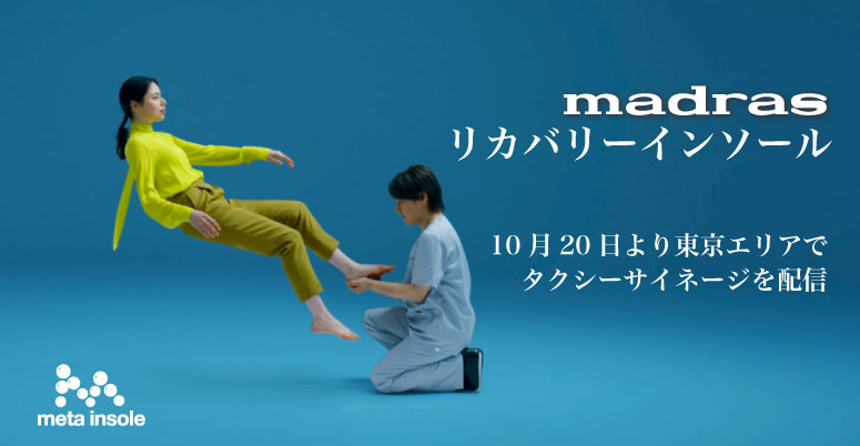 履くだけで疲労回復につながるmadrasリカバリーインソールを紹介するタクシーサイネージを、