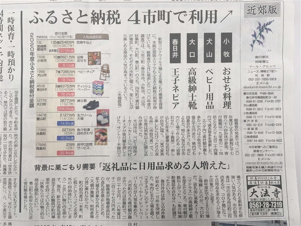 9/14中日新聞(近郊版)に大口町ふるさと納税に関する記事が掲載されました。