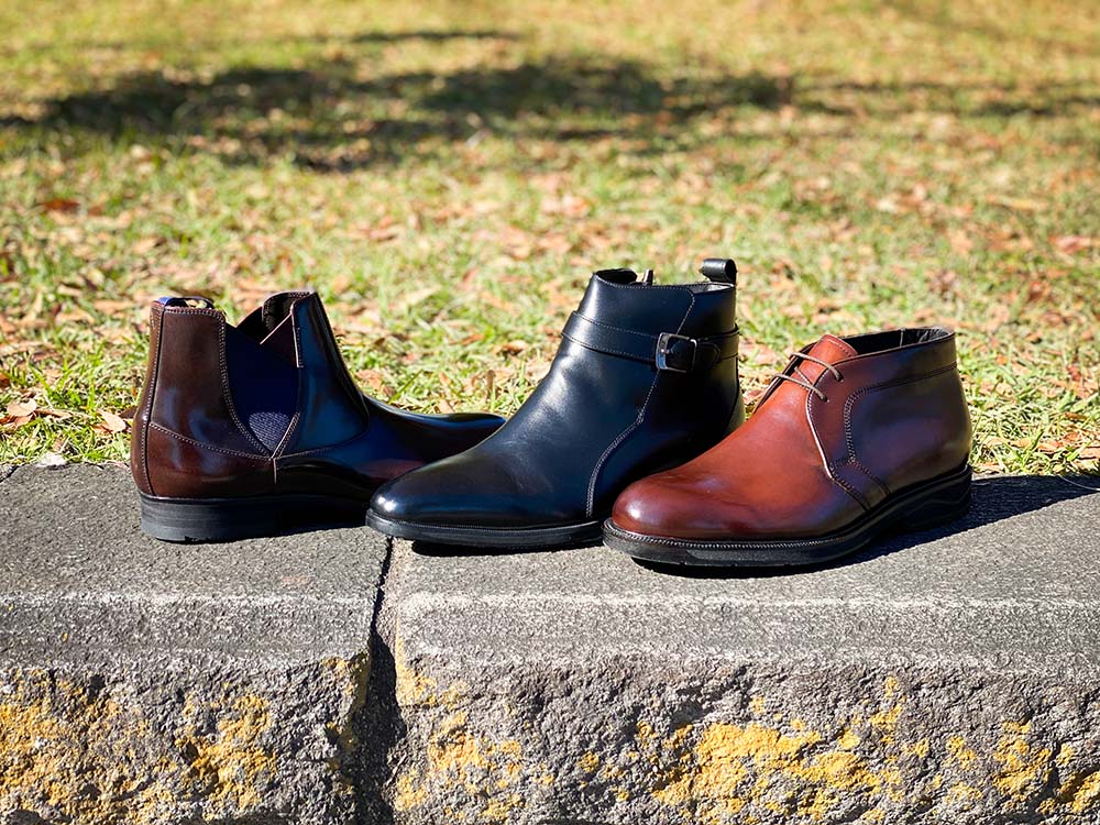 画像右はチャッカブーツ。ポロ競技に由来しスポーティー。