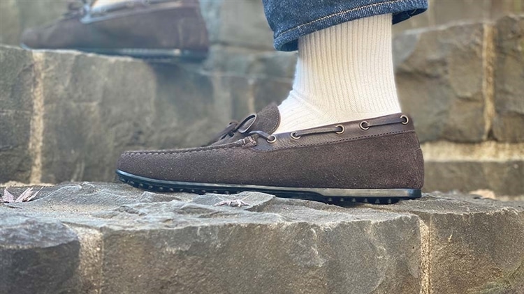 粗さのある起毛感が適度なカジュアルさを演出し、スニーカーからドレスシューズまで