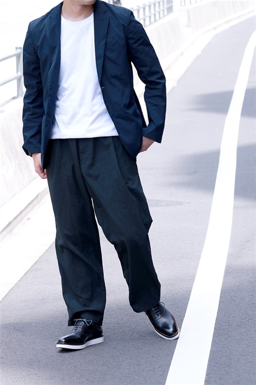 今回はシャリっとしたポリエステル素材のネイビーのジャケットにダークグリーンのパンツ、