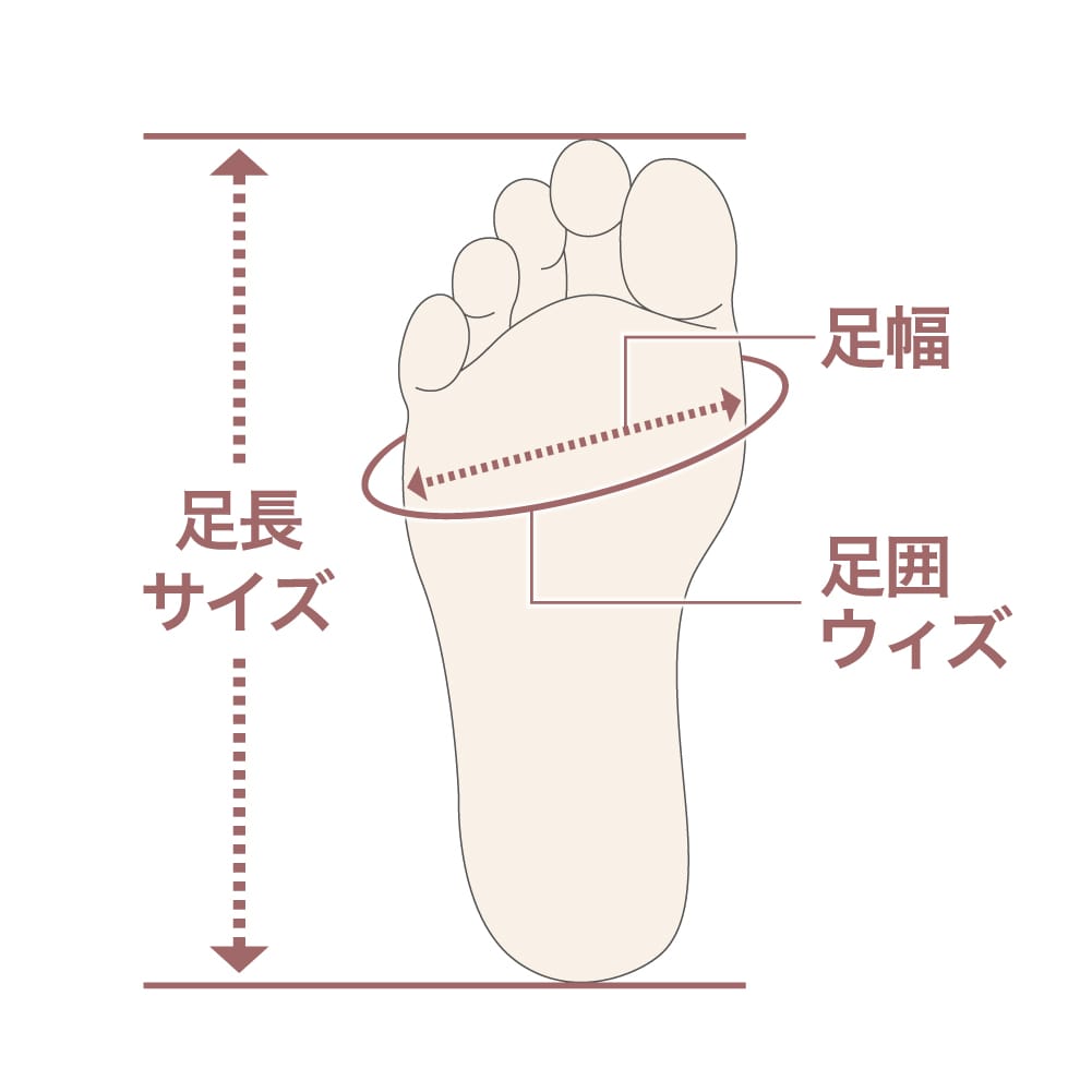 足の寸法は、足長をサイズ、足囲をウィズで表します。 サイズとは、平らなところに垂直に立ち、両足に平均に体重をかけた姿勢のときの足を前後からはさみ、かかとの後端から最も 長い足指の前端までの距離を言います。 ウィズとは、平らなところに垂直に立ち、両足に平均に体重をかけた姿勢のときの、足のふみつけ部の親指の付け根と小指の付け根をとりまく、 まわり寸法(ボールガースともいう)を言います。