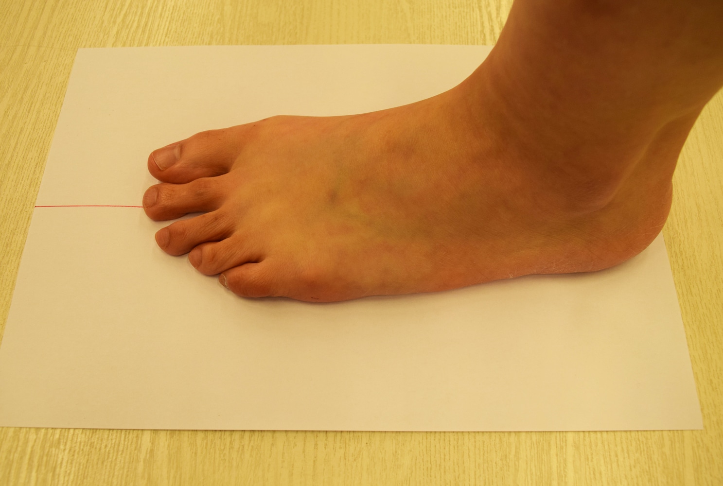 無地で足がおさまる大きさの紙の中央に、短い方の辺に対して直角に端から端まで直線を引きます。平坦な所にその紙を敷き、紙に引いた直線がつま先からかかとまで通る形で紙の上に直立して両足に均等に体重をかけます。この時、かかとの端を紙の端に合わせます。