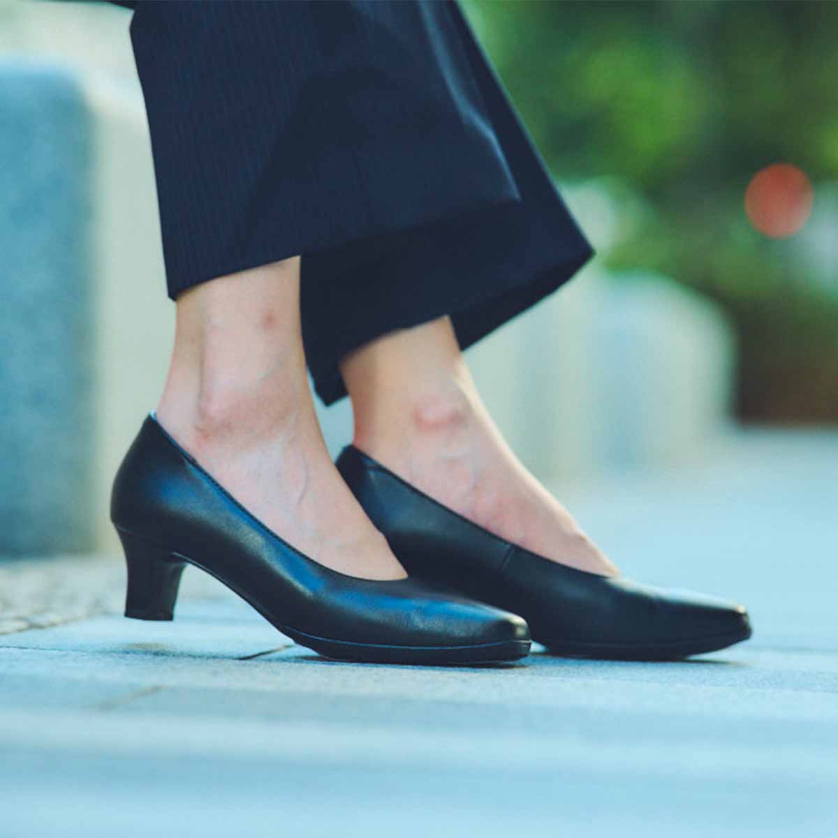 撥水加工を施してありお出かけ先で突然の雨でも安心です☂仕事用や冠婚葬祭、就活用など幅広くお使いいただけるブラックのベーシックパンプスです。