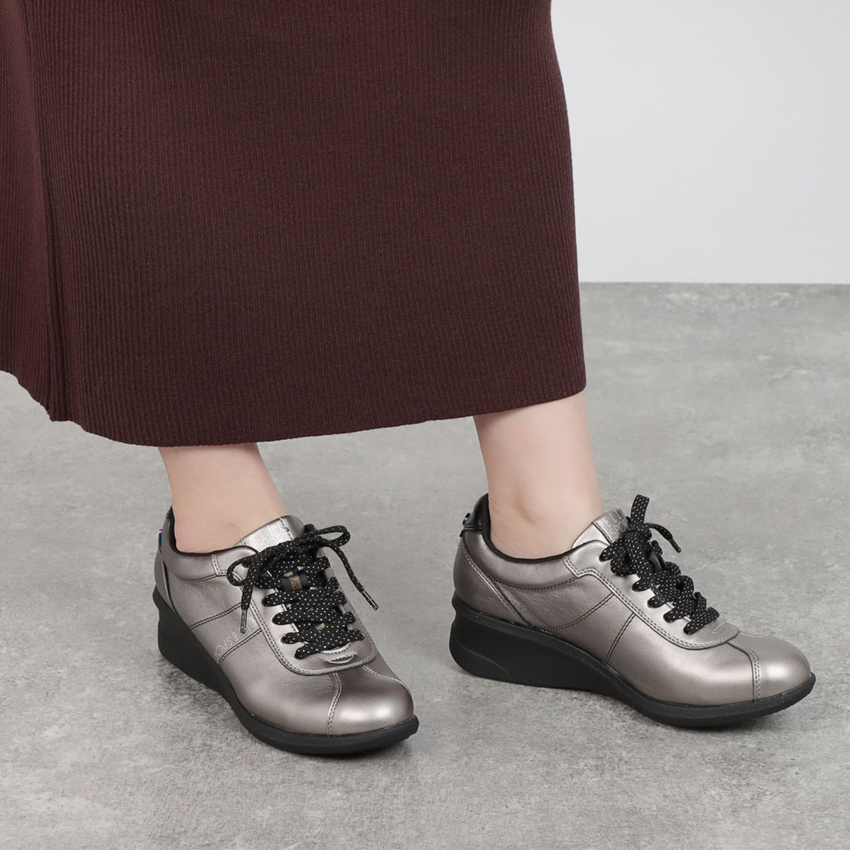 エレガントな印象のウェッジヒールが特徴のレースアップシューズ。ソフトで足馴染みの良いソフトストレッチPU素材を使用。キラキラと光るレースアップがアクセントに。