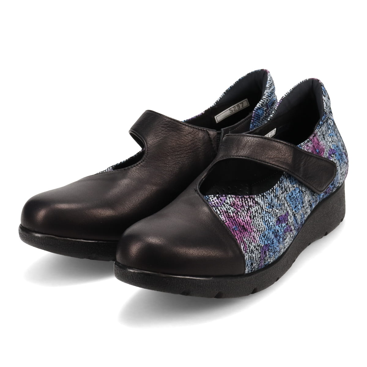 サイドのデニム風の花柄プリントレザーが足元を華やかに引き立てるおしゃれなデザインのカジュアルシューズです。