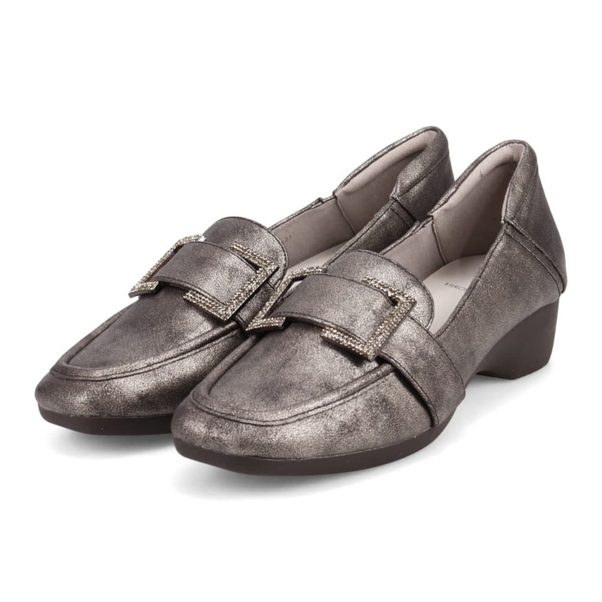 マットな質感のヌバックと、滑らかなスムース素材を組み合わせたローファーに、大ぶりのラインストーンバックルをプラス。足元にエレガントなアクセントを添えます。
