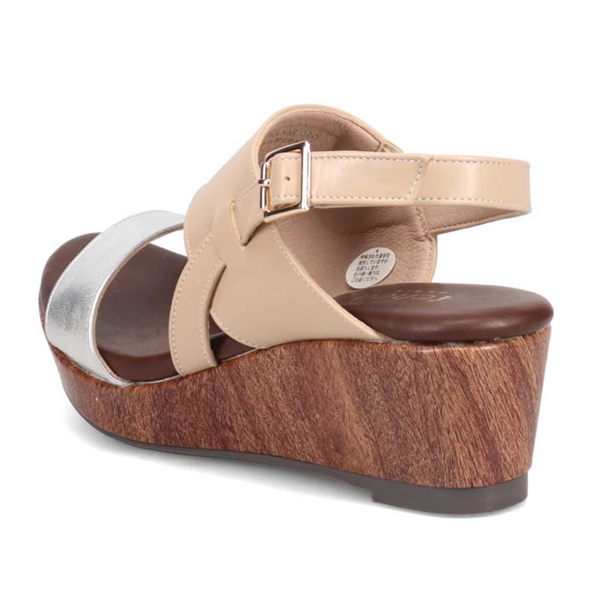 異素材コンビの色目展開に木目調のウエッジヒールが大人カジュアルな夏の装いにピッタリです。