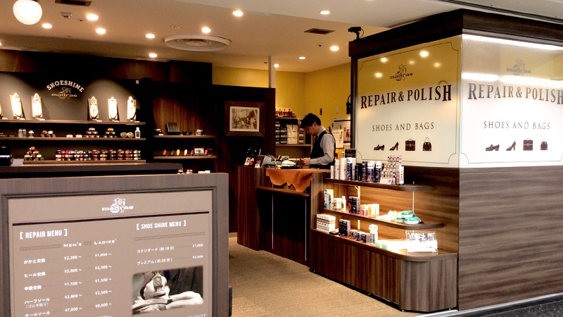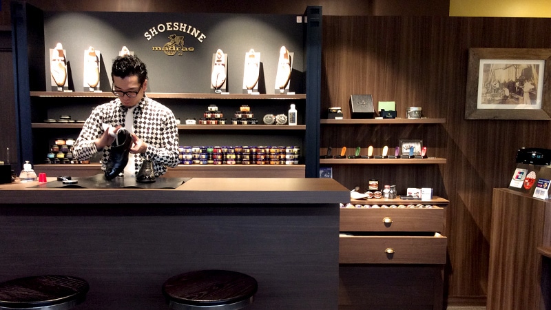 靴を持ってご来店いただければ、店内をご覧になられる間に靴磨きサービスを行っております。いつでもきれいな靴と過ごしていただきたいという、マドラスの想いを込めたサービスです。